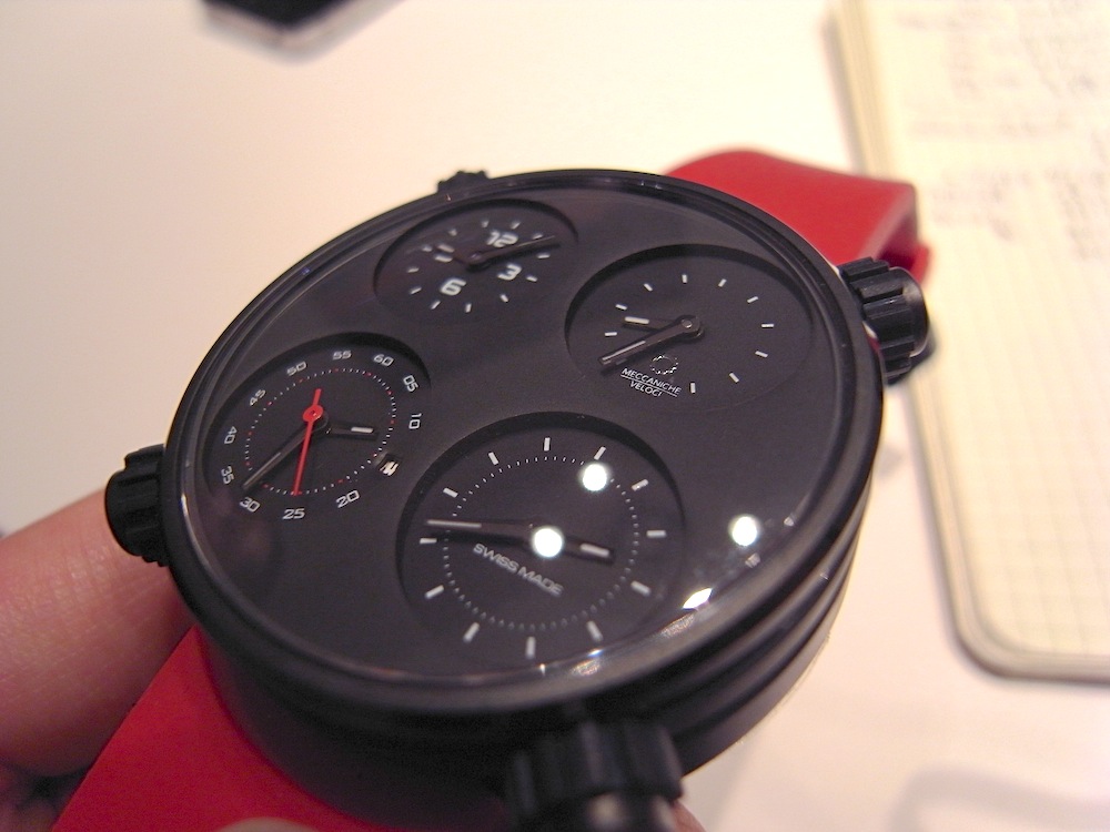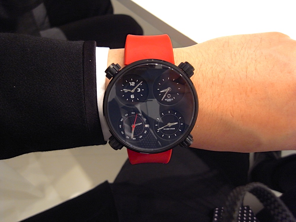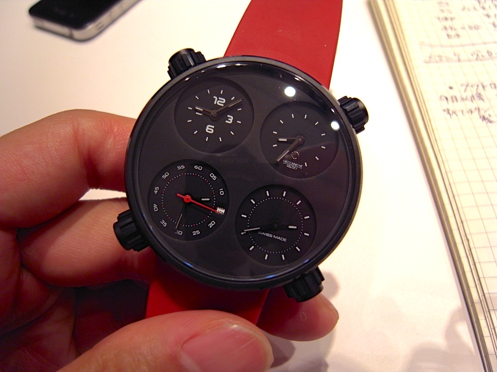 1つの時計に4つの時間を表示する窓が付いたモデルですが