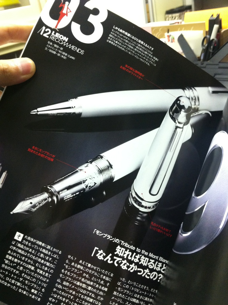 白いペン Leave a reply 今月号の雑誌、LEONでモンブランの新作ペンが大きく取り上げられていました! 以前このブログでもご紹介したものですが、ジュネーブサロンで時計以上に気に入ってしまったという、超魅力的なペンです。 僕も自分用で久しぶりにボールペン勝ってしまいそうです☆☆