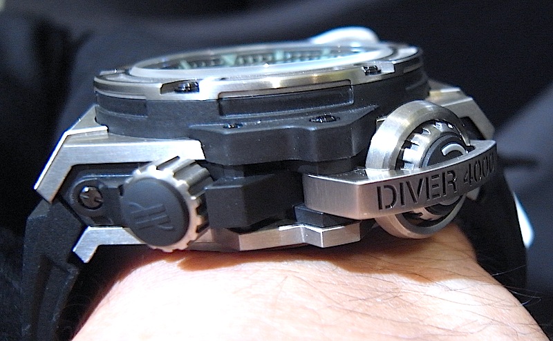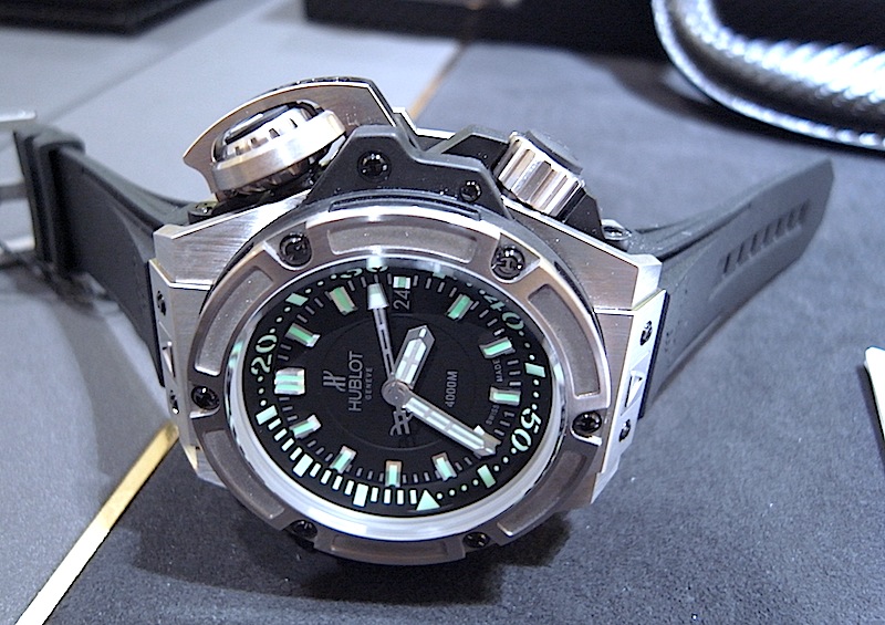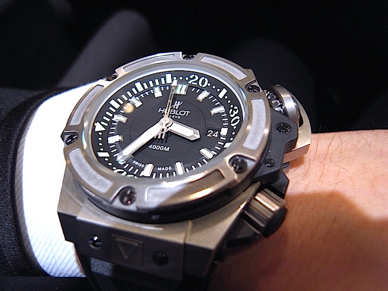 KING POWER DIVER 4000 バーゼル2011 ウブロ新作01 Leave a reply 前回のSIHHの時にもご紹介しましたが 改めてウブロの新作をご紹介します! キングパワー ダイバー4000 チタニウム製 4000m防水 ケース径 48mm 税込予価 1,743,000円 世界限定 500本 デザイン、でかさ、防水性、どれをとっても型破りな時計です! おとなしいキレイな時計も好きですが、こういう時計も大好きです(*^_^*) 本当にプロのための道具って言う感じです。 6月頃入荷予定です☆