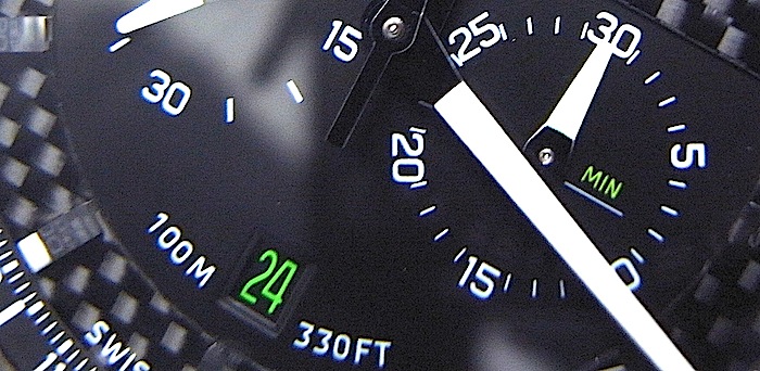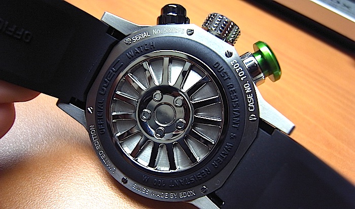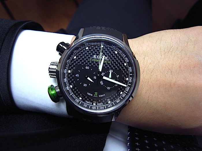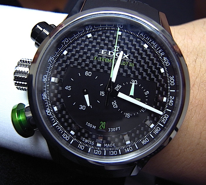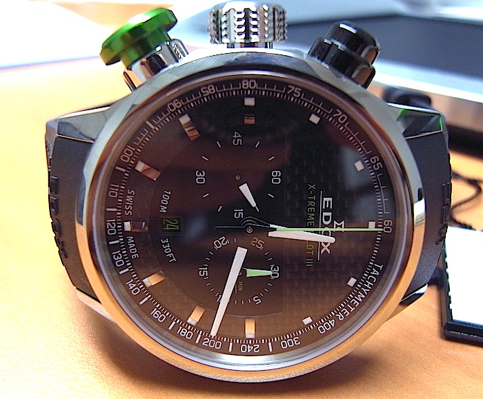 ケースサイズ45ミリ、チタンケース、カーボンダイヤル、グリーンプッシャー