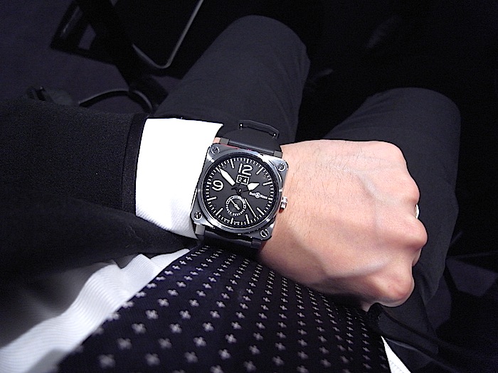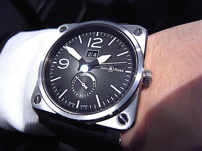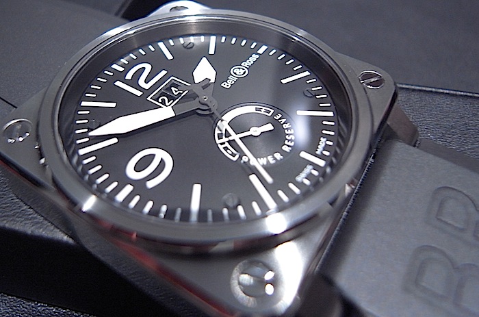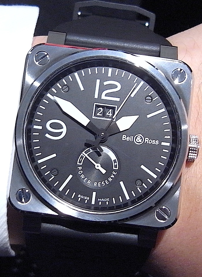 BR03 ビッグデイト パワーリザーブ バーゼル2011 ベル&ロス新作07 Leave a reply こちらは定番として登場、 BR03 ビッグデイト パワーリザーブ SS 税抜予価45万円です。 なにげにこのビッグデイトという機構、 実用性の高さから人気があります。 やはりパッと見たときに時間も日付もよく分かるというのは 時計にとって大事な機能性だということだと思います。 そしてパワーリザーブ。 こちらも自動巻だったら必要じゃ無いんじゃないか、 と、思いますが この機構も付いている方が人気が高いです。 黒い文字盤に白だけではなく、グレーの色が入っているところも この時計のポイントです。