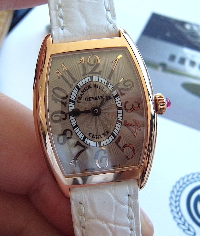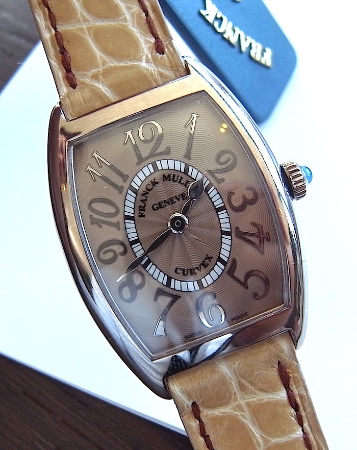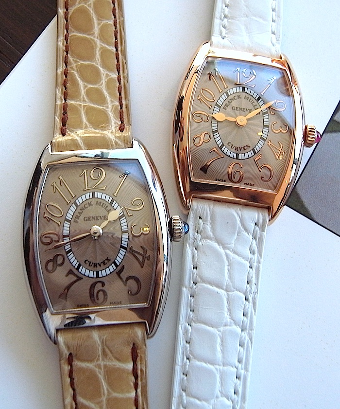 2011 フランクミュラー新作06 ミルクティーベージュ トノー型 Leave a reply 昨年登場して大人気だった ミルクティーベージュのトノー型が登場です。 ホワイトゴールド、ピンクゴールド、共に 予価997,500円 です。 ベージュと名前がついていますが 文字盤に光が当たると、ギヨシェに光が反射して ゴールドのようにキラキラと輝きます これがなんとも美しく高級感を引き立てます 昨年のロングアイランドバージョンは店頭にもありますので ぜひチェックしてみてください。 サイズは17サイズという 一番女性にフィットするサイズです。