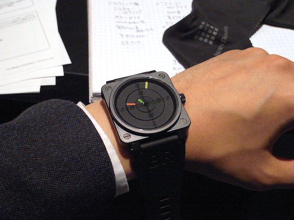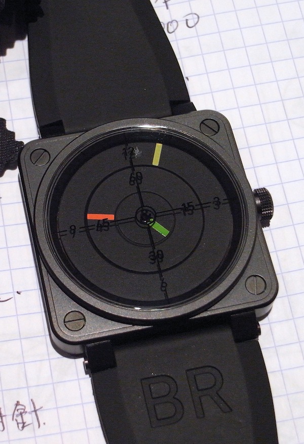 Bell & Ross(ベル&ロス)Basel 2010 新作 part.5 Leave a reply BR01 – 92 RADAR(レーダー) です! 予価が598,500円 名前の通りコックピットのレーダーをイメージしている この時計、時間の読み方は?というと、 一番外(赤)が時針、 真ん中(黄)が分針、 で内側(緑)が秒針です。 ぱっと見るとどれがどの針なの?? って感じですけど、 実際のレーダーと同じように 中心に近づくほど早く動くようになってる という理屈です。 なるほど☆ こちらは500本の限定です!