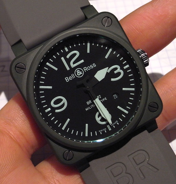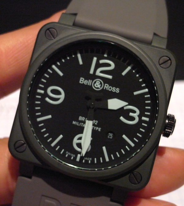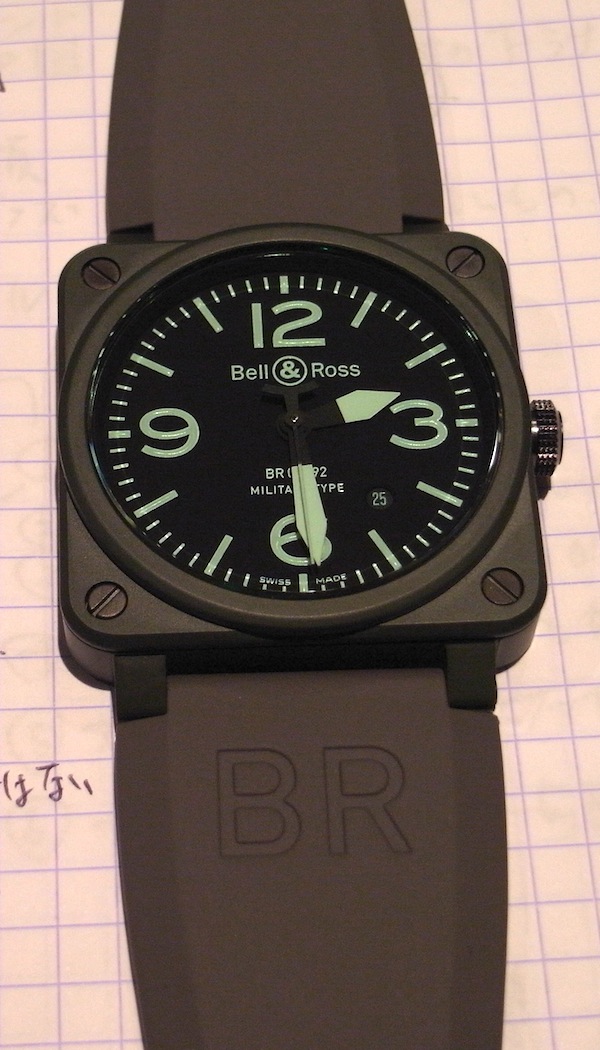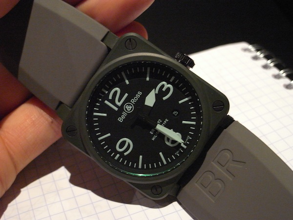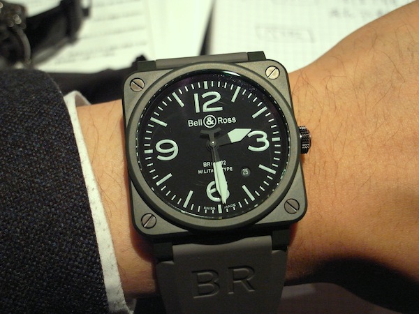 Bell & Ross(ベル&ロス)Basel 2010 新作 part.2 Leave a reply こちらは BR03 – 92 MILITARY CERAMIC(ミリタリーセラミック) 年間500本の生産。 ロレックスのミルガウスでも採用された グリーンガラスを使用。 ケースも迷彩カラーのフルセラミック製。 このモデルは的に知られず行動しながら戦闘態勢を維持することが 生死を分かつジェット戦闘機のパイロットのためにデザインされたそうです!!(^_^;) まさにプロのための道具ですよね☆ 装着すればパイロットの気分になれそうです。 予価は472,500円