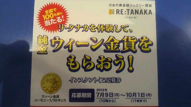 創業祭!! Leave a reply 先日はトミヤ創業祭2012にたくさんのご来場ありがとうございました また、せっかくお越しいただいたのに、バタバタしてしまい ご案内出来なかった方、申し訳ございませんでした。 今年は創業祭中に梅雨も明け、良いお天気の3日間でした 創業祭については後日どのような雰囲気だったかご報告していきたいと思います ~・~・~・~ ゴールドからのご案内 ~・~・~・~ 現在、トミヤ本店3階ゴールドフロアでは10/1まで 「リ・タナカを体験して、ウィーン金貨をもらおう!」 キャンペーンをしています。 ジュエリー・工芸品などのリサイクルでお持ちいただいた方が対象です。 お家に眠ったままの物がございましたらぜひ査定にお持ちください