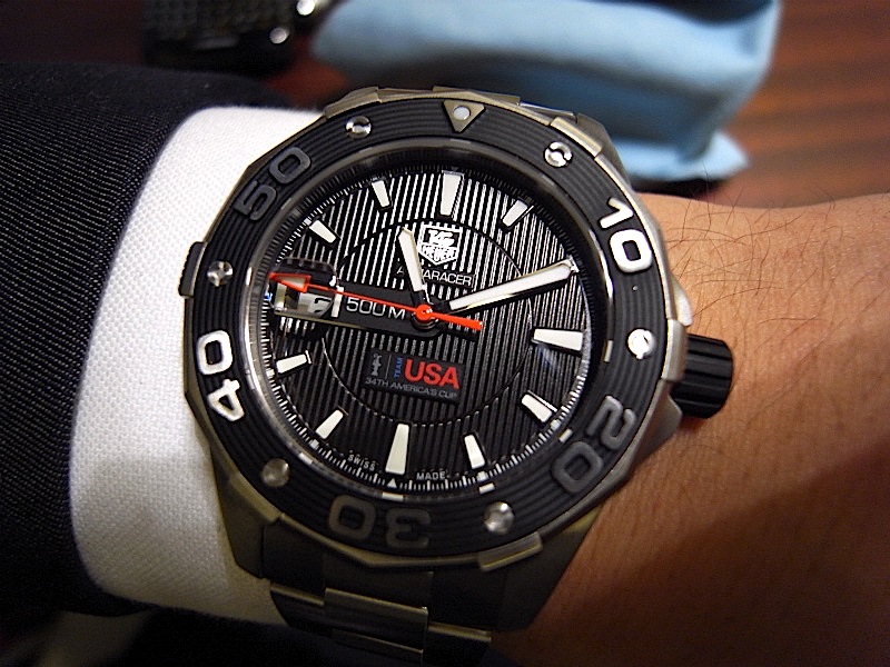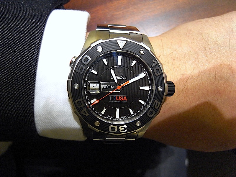 第34回アメリカスカップでタグ・ホイヤーの時計とサングラスを身につけて