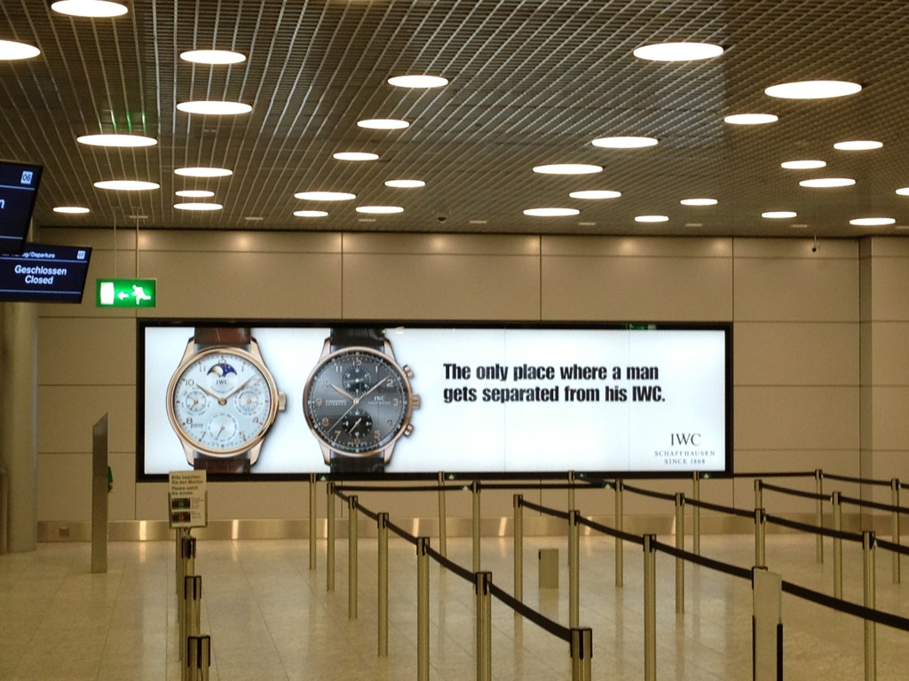 帰国します! Leave a reply チューリッヒ空港の至る所にIWCの広告が。 色々と面白い言葉が書いてますが、なかでも手荷物チェックのところのコピーが良くて、 The only place where a mangets separated from his IWC. あなたのIWCと離れる唯一の場所 ここ以外ではいつもIWCをしていてくださいね、という意味だと思います。 素敵な広告です☆( ´ ▽ ` )ノ